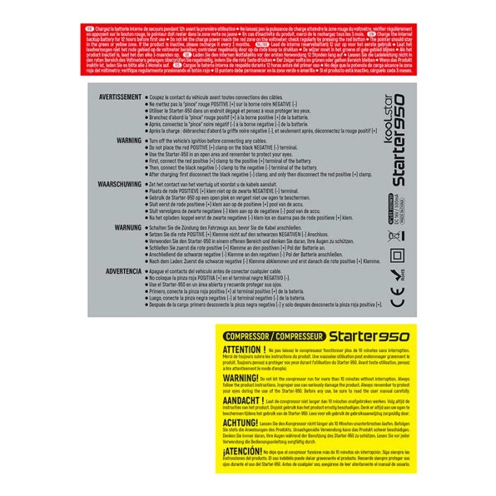 | Características adicionales | BOOSTER DE BATERÍA 12V—15AH-Voltímetro que muestra el nivel de carga interna de la batería-12V 15A con indicador de carga LED-Protección automática contra sobrecargas del circuito-Corriente de pico: 900Ah-Corriente de arranque: 450Ah-Tomas DC: 12V-Salida del adaptador de carga AC: 15V, 500mA-Pinzas negativa y positiva-Cable de alimentación AC/DC (incluido)-Recarga 12V en mechero (cable incluido)-Luz LED de emergencia y trabajo 3,2V/0,5W-Advertidor sonoro de polaridad-Compresor de aire: 18 BAR / 260 PSI-Manómetro de presión-Puntas adicionales (balón, estándar) incluidas-Tiempo de carga: 20 horas-Batería: Plomo-ácido sellada, 12V-15Ah-Apto para motores Diésel de menos de 2.0L-Apto para motores de Gasolina de menos de 3.0L |