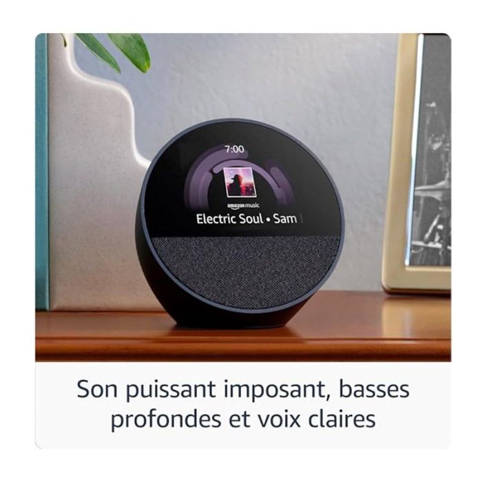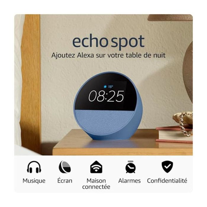 | Características adicionales | - ECHO SPOT: un despertador conectado elegante con un sonido de calidad y Alexa, para despertarte, relajarte y mucho más. - DESPERTADOR CONECTADO PERSONALIZABLE: consulta la hora, el tiempo y el título de las canciones de un solo vistazo, controla tus dispositivos conectados compatibles y mucho más. Personaliza tu pantalla seleccionando el estilo de esfera y el tema de color que prefieras. - SONIDO POTENTE E IMPACTANTE: disfruta de un sonido rico, graves profundos y voces claras. Simplemente pide a Alexa que reproduzca música, podcasts y audiolibros de tus proveedores de servicios favoritos (Amazon Music, Apple Music, Spotify, etc.). Consulta el título de las canciones de un solo vistazo y toca la pantalla para controlar tu música. - DESPERTAR SUAVE: configura una rutina Alexa para despertarte con música y una iluminación progresiva. Consulta la hora y tus recordatorios de un solo vistazo o pide a Alexa que te dé el tiempo. - CONFORT EN CASA: controla tus dispositivos conectados compatibles. Simplemente pide a Alexa que encienda las luces o toca la pantalla para atenuarlas. - DISEÑADO PARA PROTEGER TU PRIVACIDAD: Echo Spot cuenta con múltiples elementos de protección y control de tu información personal, incluido un botón de apagado del micrófono que permite desconectar electrónicamente los micrófonos. - DISEÑADO CON UNA PREOCUPACIÓN POR LA SOSTENIBILIDAD: este dispositivo está fabricado con un 36 % de materiales reciclados. |