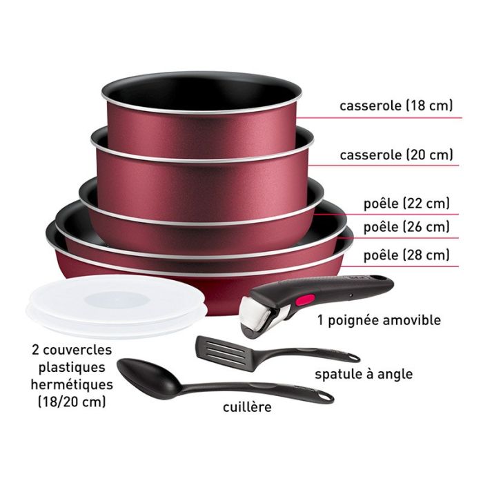 | Características adicionales | Batería de cocina TEFAL INGENIO 10 piezas: - 3 sartenes 22 26 28 cm - 2 cacerolas 18 20 cm - 2 tapas de plástico 18 20 cm - 1 mango extraíble - 2 utensilios: cuchara y espátula angular * Fabricación francesa: Esta batería de cocina ha sido fabricada en Francia (excepto las tapas y accesorios). Todos los productos Tefal se fabrican según los criterios de calidad más estrictos, independientemente del lugar de producción. * La sartén de inducción Ingenio más ligera*: Gracias a nuestra nueva tecnología Light Tech, las sartenes Ingenio Simply Cook son hasta un 28 % más ligeras (en comparación con la gama de inducción clásica Ingenio Eco-Resist de Tefal). * Revestimiento antiadherente Titanium: Revestimiento de titanio para un alto rendimiento antiadherente, que permite una limpieza sin esfuerzo y una cocción que conserva todos los sabores y nutrientes. * Mango Ingenio robusto: Un mango extraíble para un uso intensivo con total tranquilidad: sistema de seguridad con 3 puntos de fijación, que puede soportar hasta 10 kg (según pruebas internas) y cuenta con una garantía de 10 años (esta garantía Tefal no afecta los derechos legales de los consumidores, que no pueden ser excluidos ni limitados, ni los derechos contra el distribuidor donde se adquirió el producto). * Revestimiento antiadherente en el interior: Diseñado para satisfacer tus necesidades culinarias diarias, el revestimiento antiadherente de alto rendimiento en el interior y exterior garantiza una cocción óptima y una limpieza fácil. * Calentamiento rápido: Gracias a la tecnología Light Tech, la sartén se calienta en un abrir y cerrar de ojos para una cocción rápida. Compatible con todas las superficies de cocción, incluida la inducción. |