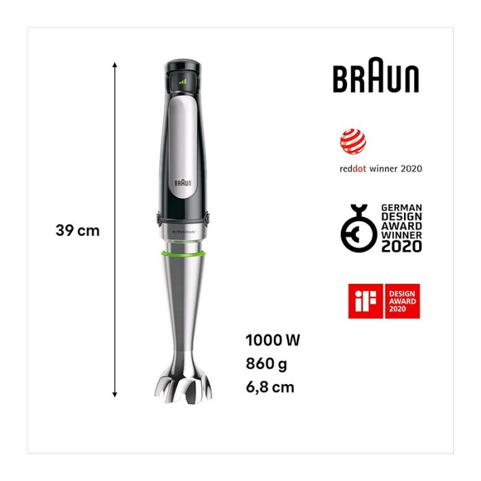 | Información adicional | La nueva batidora de mano Braun Minipimer 7 está diseñada para ayudarte a preparar comidas saludables para tu familia y tus amigos, de forma rápida y sencilla. Ahora cuenta con la primera tecnología ACTIVEBlade del mundo. Esta innovadora cuchilla flexible te ofrece un 250 % más de superficie de corte activa para trabajar*: será tu mejor ayudante en la cocina para facilitarte el trabajo. También incorpora la nueva tecnología Easy SmartSpeed de Braun, que te permite tener todo bajo control con solo pulsar un botón. Para ajustar la potencia de forma intuitiva y sin interrupciones, basta con presionar el botón de control. * Comparadas con las batidoras de mano de Braun sin tecnología ACTIVEBlade. MOTOR DE 1000W: la batidora posee un potente motor de 1000 W y un control automático de velocidad TECNOLOGÍA ACTIVEBLADE: las cuchillas bajan y suben permitiendo así una mayor eficacia incluso con los ingredientes más difíciles e invirtiendo un 40% menos de esfuerzo TECNOLOGÍA SPLASH CONTROL: la forma de la campana está diseñada para evitar las salpicaduras y mantener tu cocina limpia MENOS SUCCIÓN: hasta un 55% menos de succión para un uso sin esfuerzo y un control perfecto ACCESORIOS: vaso medidor sin BPA de 600 ml. Aptos para lavar en lavavajillas o a mano con agua y jabón |
