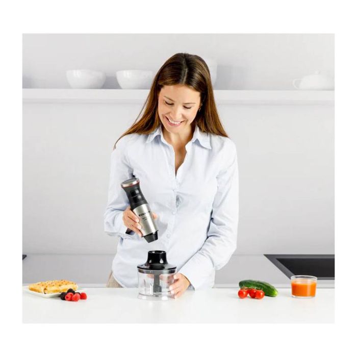 | Características adicionales | 1500W: para triturar y mezclar rápido, sin esfuerzo Diseñado en España con calidad y confianza en cada detalle Potente motor de alto rendimiento Regulador de 20 velocidades ajustables Función TURBO para conseguir la máxima potencia Turbo Rotation System: Este sistema exclusivo optimiza la entrada y el movimiento de los alimentos en la campana. Gracias a él, los ingredientes se redirigen hacia las cuchillas con más eficacia, lo que acelera el triturado y mejora la textura final de cada preparación. Cuchillas de acero inoxidable de alto rendimiento y doble efecto: Baten y pican Pica hielo Diseño ergonómico con agarre soft-touch Fácil montaje de la varilla, lista en segundos sin complicaciones Varilla en acero inoxidable de alta resistencia: resistente, duradera y pensada para el uso diario Diseño de la campana antisalpicaduras Batidora y accesorios libres de BPA Accesorios y varilla aptos para lavavajillas Accesorios: Vaso medidor de 700 ml, picador de 350 ml y emulsionador |
