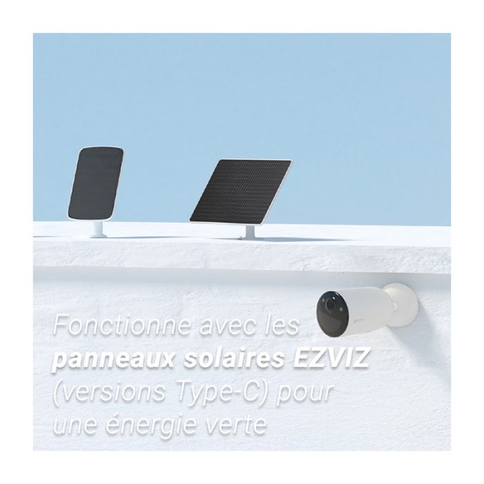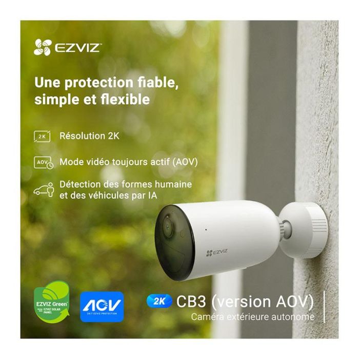 | Características adicionales | Una protección fiable, simple y flexible Disfruta de una protección exterior mejorada de forma más inteligente con la EZVIZ CB3, ahora equipada con la última función Always-On Video (AOV) de EZVIZ para permitir la grabación 24/7 en una cámara alimentada por batería para una tranquilidad prolongada. Dotada de diversas funciones como detección avanzada, visión nocturna en color, defensa activa y mucho más, protege activamente lo que es valioso para ti mediante controles remotos versátiles y solo requiere una instalación extremadamente sencilla para un rendimiento duradero. - resolución 2K - Modo vídeo siempre activo AOV - Detección de formas humanas y vehículos por IA - Visión nocturna en color - Hasta 120 días de autonomía de batería (5.200 mAh) - Funciona con los paneles solares EZVIZ (versiones Tipo-C) para energía verde - Defensa activa con luz estroboscópica y sirena - Comunicación bidireccional - Alertas vocales personalizables - Compatible con red Wi-Fi 6 (2,4 GHz) - Diseño resistente a la intemperie - Compresión de vídeo H.265 - Integración inteligente con Google Assistant y Amazon Alexa - Compatible con tarjeta MicroSD (hasta 512 GB) y almacenamiento EZVIZ CloudPlay |