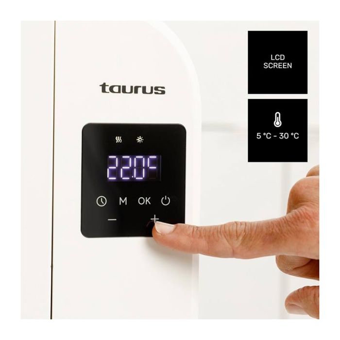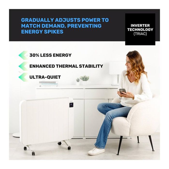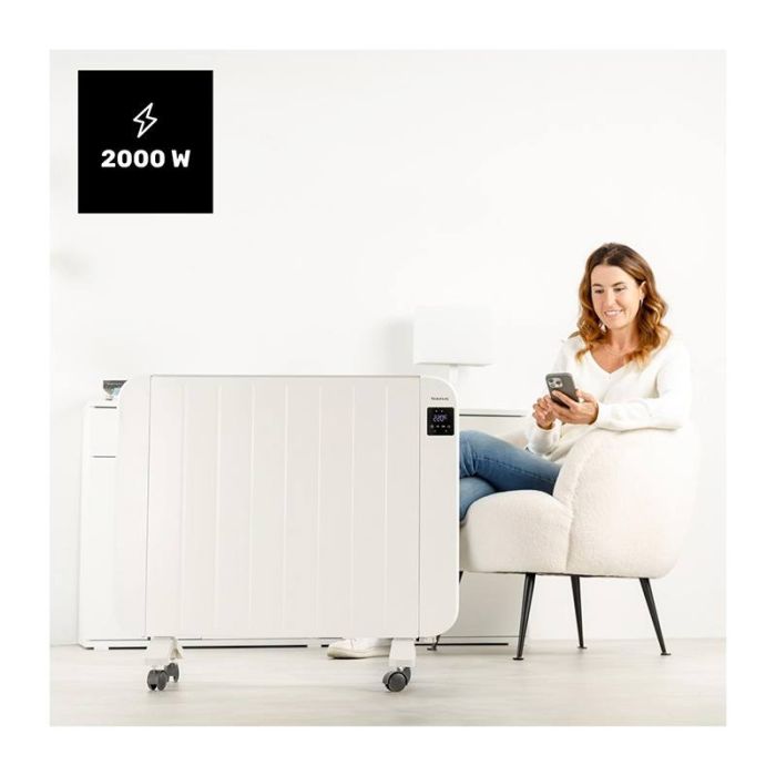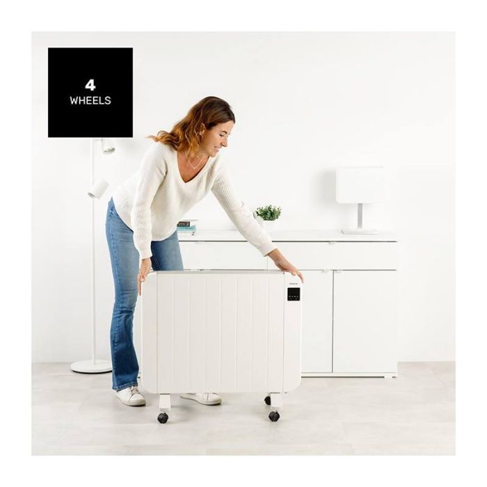 | Características adicionales | POTENCIA Posee 2000 W con tecnología Inverter (Triac) que ofrece un ahorro energético de hasta el 30 %, aporta más estabilidad térmica y máximo silencio. MATERIALES Dispone de 10 elementos calefactores de aluminio para un calor limpio que no reseca el ambiente; incluye soporte de pared y ruedas. CONTROL Incluye un termostato ajustable de 5 °C a 30 °C, programación 24/7, pantalla LCD con temporizador y modos ECO, Confort, Noche y Anti congelación. OVERPTOTECT SYSTEM Sistema de seguridad contra el sobrecalentamiento gracias a su botón de desconexión total. PROTECCIÓN Incluye un sensor de ventanas abiertas, bloqueo infantil, sistema antivuelco y certificación IP24 frente a la entrada de sólidos y líquidos. |