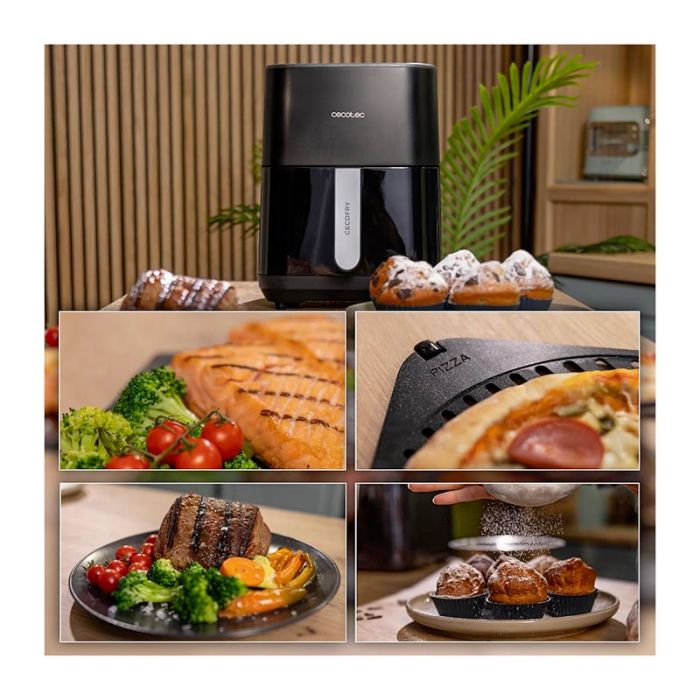 Información adicional | Cocina todo con tu Cecofry gracias a su diseño que incorpora freidora de aire, grill para carne y plancha para prepara pizzas con masas óptimas Consigue resultados óptimos en menos tiempo; gracias a su diseño con doble resistencia arriba y abajo; distribuye el calor de manera uniforme, asegurando resultados consistentes y deliciosos en cada preparación, sin que tengas que girar tus alimentos de forma constante. Marca tus carnes con la placa Grillin Style y consigue el punto óptimo en tus cortes de carne favoritos; prepara las pizzas auténticas en su plancha y consigue masas óptimas crujientes y doradas. Freidora óptima con 4 litros de capacidad; prepara deliciosas comidas para compartir con tu pareja o disfruta de platillos individuales con suficiente espacio para tus necesidades culinarias; su potencia de 1900 W permite cocinar recetas con una cucharada de aceite, reduciendo significativamente la cantidad de grasas en tus preparaciones; disfruta de platos saludables y deliciosos, sin sacrificar el sabor y la textura que tanto te gusta. La freidora permite controlar el progreso de tus elaboraciones sin necesidad de abrir la cubeta a través de su ventana de visualización; regula la temperatura entre 40-200°C, y ten un control total sobre tus preparaciones culinarias; ajusta la temperatura según tus necesidades específicas, desde cocciones lentas a alta temperatura hasta dorar y gratinar a lo óptimo |