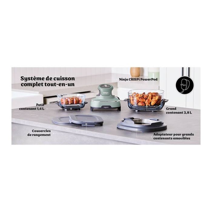 | Características adicionales | El sistema de cocción portátil Ninja Crisp es un aparato compacto que ofrece la potencia de una freidora de aire caliente de tamaño completo de 1.700 W en un formato portátil. Incluye un recipiente pequeño TempWar de 6 tazas (1,4 l) y uno más grande de 4 pintas (3,8 l). Para preparar en 7 minutos comidas rápidas en porciones individuales, compartir snacks crujientes para llevar o servir a muchos invitados, el sistema Ninja Crispi te facilita la tarea. El vidrio borosilicatado resistente soporta variaciones extremas de temperatura; ideal para pasar directamente de alimentos congelados a crujientes. La limpieza es sencilla: todos los accesorios son aptos para lavavajillas y están diseñados para encajarse y facilitar el almacenamiento. • SISTEMA TODO EN UNO: Incluye el módulo Ninja Crispi PowerPod, recipientes de vidrio TempWare de 4 pte (3,8 l) y de 6 tazas (1,4 l), y 2 tapas para almacenamiento. • MÓDULO CRISPI POWERPOD: La potencia de una freidora de aire caliente de tamaño completo en la palma de tu mano. • RECIPIENTES PARA CANTIDADES GRANDES Y PEQUEÑAS: El recipiente de 6 tazas (1,4 l) permite cocinar una comida individual en 7 minutos, mientras que el recipiente de 4 pte (3,8 l) permite cocinar un pollo de 4 lb (1,8 kg) y verduras. • RESISTENTE A LOS CHOQUES TÉRMICOS: El vidrio borosilicatado puede pasar de congelado a crujiente en pocos minutos. • FUNCIONALIDAD 4 EN 1: Max Crisp (Crousti Max), Hornear, Freír al aire (cocción crujiente) y Recrisp (volver a crujir). • PROTECCIÓN FIJA CONTRA EL CALOR: Los pies resistentes al calor y fijados permanentemente pueden colocarse con seguridad sobre granito, laminado, cuarzo, encimeras, mármol y más. |