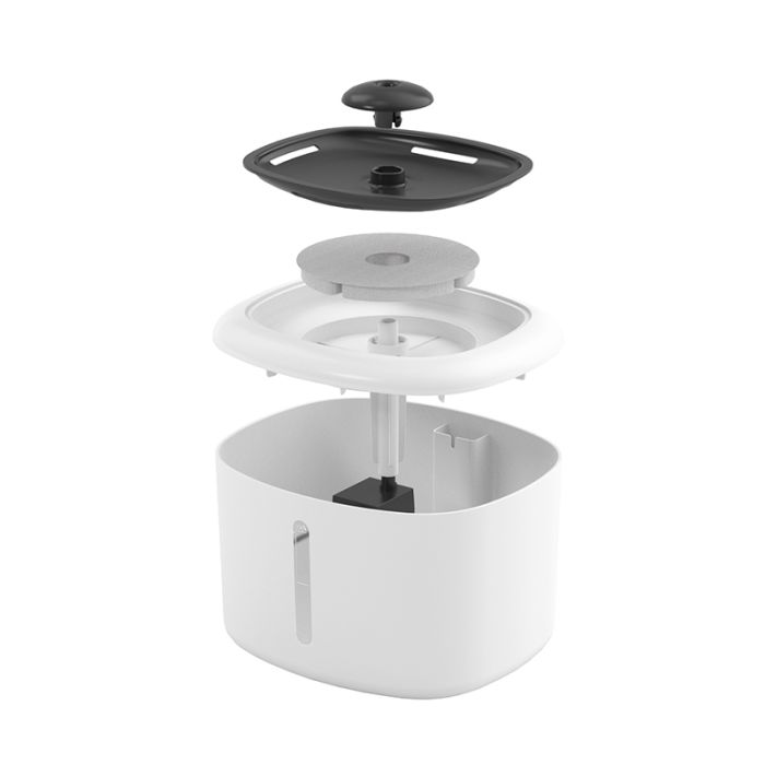 | Características adicionales | Fuente de agua para gatos y perros pequeños - Capacidad 2,5L - Garantiza un agua oxigenada, sana, limpia y filtrada - Indicador de nivel de agua - Muy silenciosa (menos de 30dB) - Filtro de carbón activo reemplazable (1 filtro incluido con la fuente) - Puesta en marcha rápida y uso fácil - Apagado automático si el nivel de agua es demasiado bajo - Alimentación por cable USB (adaptador USB incluido) - Voltaje de la bomba: 5V - Potencia nominal 0,25W * Consejo de uso: limpiar la fuente una vez a la semana. cambiar el filtro una vez al mes (filtro vendido en este sitio) |