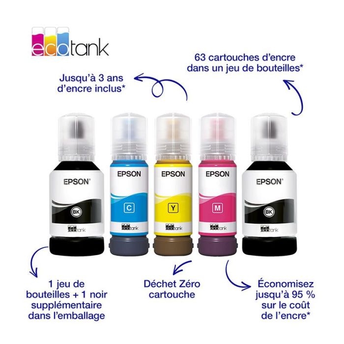 | Características adicionales | CARACTERÍSTICAS PRINCIPALES ► Ahorre hasta un 95 % en el coste de la tinta* Gracias a los depósitos de tinta recargables EcoTank, reduzca drásticamente sus gastos de impresión. ► Una impresión simplificada y ultraeconómica El equivalente de hasta 63 cartuchos incluidos en un solo juego de botellas* Hasta 3 años de tinta incluidos en la caja* Imprima hasta 15.100 páginas en blanco y negro y *5.500 páginas en color ► Rendimiento completo todo en uno Impresión, copia y escaneo a doble cara de alta calidad Alimentador automático de documentos tamaño A4 Conexión Wi-Fi fiable para imprimir dondequiera que esté Aplicación Epson Smart Panel: configure, supervise e imprima directamente desde su smartphone* ► Uso sencillo y sin complicaciones Depósito de tinta fácil de recargar con botellas Sistema anti-error: las botellas EcoTank cuentan con sistemas antiequivocación para una recarga sin dificultades |