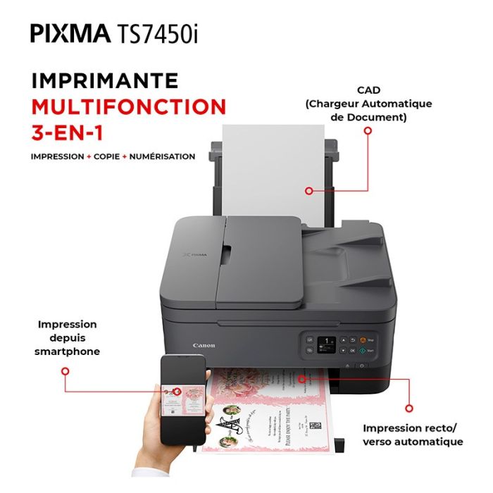 | Características adicionales | Tu compañero polivalente para el trabajo y el ocio Elegante, asequible y fácil de usar, la serie PIXMA TS7450 ofrece la posibilidad de imprimir en muchos tipos de soportes creativos desde tu ordenador, tableta o smartphone. Gracias a la tecnología ADF, puedes escanear y copiar varias hojas en un tiempo récord. |