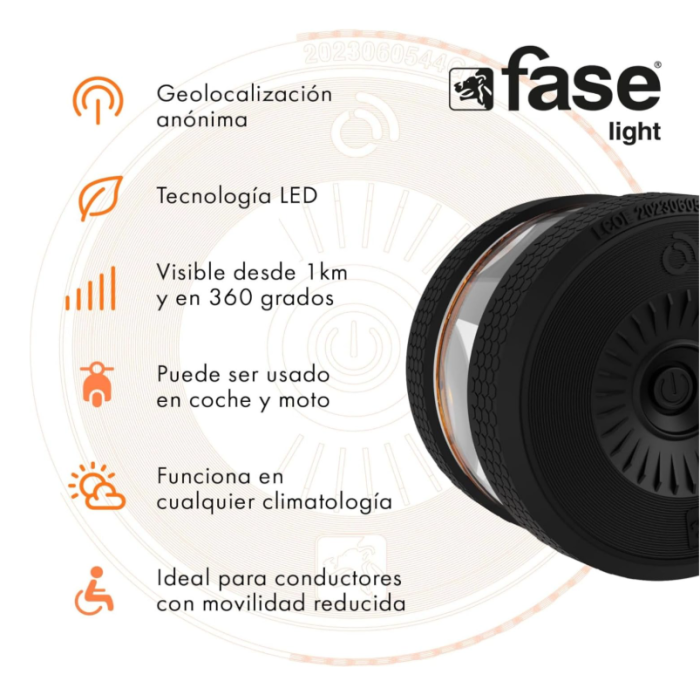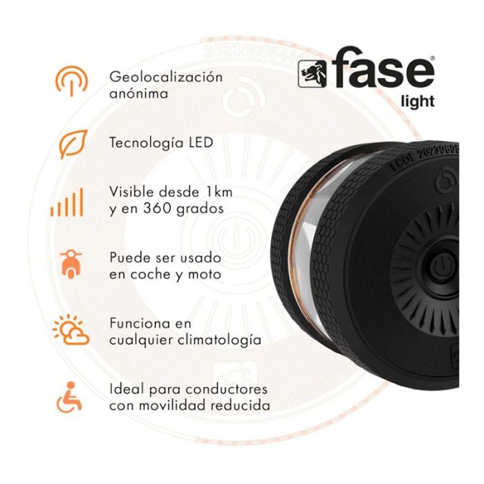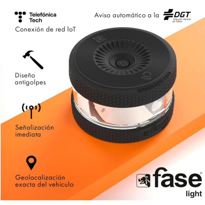 | Características adicionales | FASELIGHT SOS Alert cumple al 100% con la normativa V16 de la DGT. Desde el 1 de enero de 2026 será obligatorio utilizar balizas conectadas y geolocalizadas como esta. LCOE 2025010037G1Conectividad integradaIncluye eSIM ya activada, sin cuotas ni suscripciones. Funciona sin depender del móvil y con cobertura nacional. La señal de emergencia se envía a la plataforma SOS Alert y a la DGT 3.0 para alertar a otros conductores.Seguridad inmediataSe activa y coloca desde dentro del coche gracias a su imán de alta fijación, evitando bajar a la calzada. Luz certificada 360º con hasta 1KM de alcance.Geolocalización precisaChip de alta precisión para indicar la posición exacta del vehículo y avisar en navegadores, paneles y apps de tráfico.Diseñada para durarResistencia IP54, imán de neodimio y estable en fuertes vientos. Preparada para lluvia, polvo y condiciones extremas.Servicio de conexiónSOS Alert incluye 12 años de servicio de datos que empezarán a partir de 2026 |