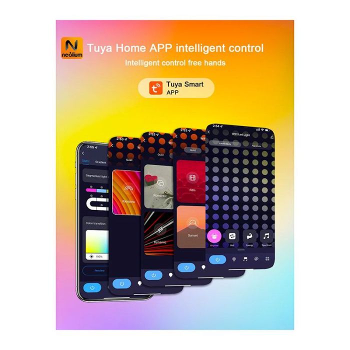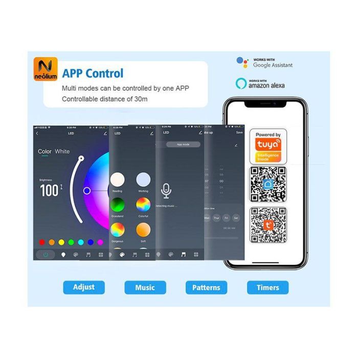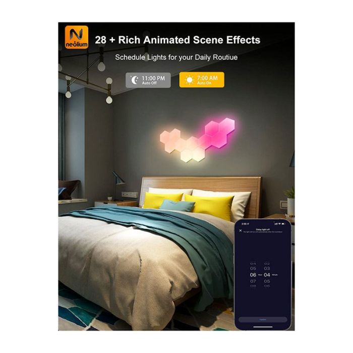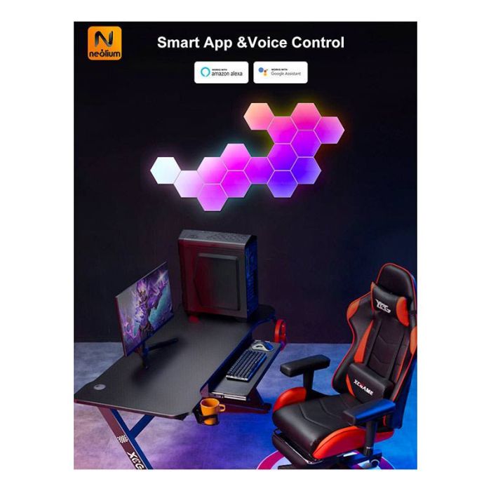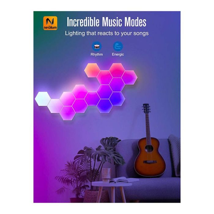 | Características adicionales | Tensión de entrada: DC 5V (Un adaptador 5V 2A puede alimentar hasta 15 módulos) Potencia: 1,5 W por módulo Consumo: 10W Color: RGBIC Método de control: WiFi 2.4GHz (802.11 b/g/n), control local o remoto Banda de frecuencias: 2,412 - 2,484 GHz Compatibilidad: iOS y Android Compartir multiusuario: Hasta 6 cuentas Tipo de control: Aplicación móvil, mando a distancia por infrarrojos (IR) incluido, y control manual mediante botones Control por App Tuya / Smart Life Estanqueidad (IP): IP20 Interior Material: Plástico + PC Funciones: Modo musical / Cambio de color Contenido de la caja: 8 módulos LED hexagonales, 1 mando a distancia por infrarrojos, conectores, 1 cable USB, adhesivos de doble cara, 1 caja de control |