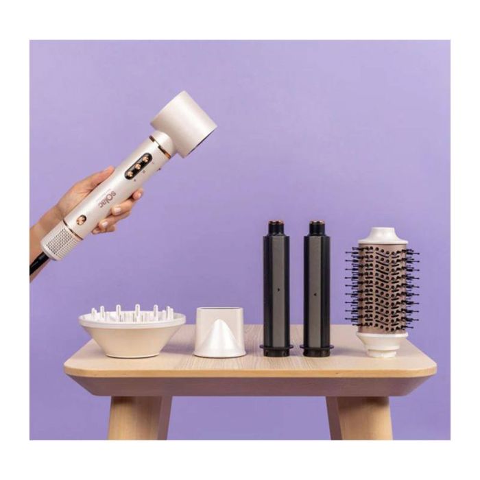 | Características adicionales | El moldeador Blast Style Pearl de Solac combina secado y peinado en un solo gesto. Con motor digital de 110.000 rpm, 1400W y tecnología iónica, cuida tu cabello mientras lo moldea. Incluye 6 accesorios magnéticos para rizar, alisar o dar volumen, control inteligente de temperatura, golpe de aire frío y diseño compacto. Ideal para conseguir acabados profesionales sin dañar la melena.Secado y peinado ultrarrápido con potencia profesional digital.Su motor digital brushless de 110.000 rpm ofrece un flujo de aire constante y preciso que seca más rápido que un motor convencional. Al no tener fricción interna, genera menos calor residual, protege mejor el cabello, es más silencioso y tiene una vida útil más larga. Ideal para quienes buscan resultados profesionales con el mínimo daño térmico y la máxima eficacia.Una melena suave, brillante y sin encrespamiento desde la primera pasada.Gracias a la tecnología Ion-Power, reduce la electricidad estática y sella la cutícula para lograr un cabello suelto, sedoso y sin frizz.Un solo moldeador para infinitos looks con 6 accesorios intercambiables.Incluye rizadores automáticos izquierdo y derecho, cepillo oval, secador, concentrador y difusor magnéticos para moldear, alisar, rizar o dar volumen con facilidad.Control inteligente para proteger tu cabello mientras lo moldeas.Con 9 combinaciones de velocidad y temperatura, control térmico automático y golpe de aire frío, cuida el cabello y fija el peinado sin esfuerzo.Accesorios:- Accesorio moldeador automático izquierdo y derechoFlujo de aire inteligente que envuelve y atrae tu cabello para formar rizos y ondas- Accesorio cepillo ovalLevanta las raíces para crear volumen y movimiento con un aspecto de ondas naturales- Accesorio concentrador magnéticoConcentra el flujo de aire en zonas específicas, para estilizar fijando el peinado- Accesorio difusor magnéticoDistribuye el aire de manera uniforme, ayudando a definir rizos y ondas naturales- Accesorio secadorPara el secado previo al moldeadoAlto: 22,5 cmAncho: 4,5 cmLargo: 4,5 cmPeso: 0,85 Kg |
