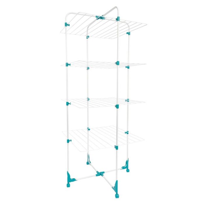 | Características adicionales | Tendedero de torre gran capacidad 4 niveles - Utilizable en media apertura para tender pequeñas coladas - Duración de secado óptima gracias a un espacio amplio entre los hilos - Fácil de mover con sus ruedas multidireccionales - Rejilla de alambre de acero soldado, recubierta de plástico para una mejor protección de la ropa Accesorios azules (esquinas, ruedas) Dimensiones abierto: 69x69x158 cm |