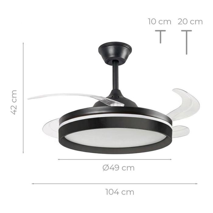 | Características adicionales | Silencioso, motor DC: nuestro ventilador de techo con luz LED y aspas retráctiles es perfecto para disfrutar de un ambiente fresco, agradable y bien iluminado. Por su diseño moderno y elegante, se integra fácilmente en la decoración del hogar. Ventajas de su motor DC: más ligero, más silencioso (menor fricción), menor consumo (hasta un 60-70 % más bajo), mayor control y más velocidades, etc. 4 aspas retráctiles, función verano-invierno: este ventilador de techo LED de calidad es resistente y duradero. Fabricado de ABS/hierro/cobre con aspas de PC. Permite 2 modos de giro (verano-invierno). Sus 4 aspas se pueden plegar y ocultar discretamente cuando no se utilizan. 6 velocidades, temporizador: nuestro ventilador de techo con mando cuenta con 6 velocidades (170-230 r.p.m.) y temporizador (1-2-4 h) para un uso más personalizado y satisfactorio. Este ventilador con luz es adecuado para estancias entre 10 y 25 m². Potencia: 80 W. Clasificación energética: E. 3 modos de luz LED: este versátil ventilador de techo con aspas retráctiles es también ideal como lámpara LED. Proporciona una iluminación eficiente y adaptada a las preferencias. Dispone de 48 LED (5000 lm, 48 W) y 3 tipos de luz: fría (6500 K), cálida (3000 K) y neutra (4300 K). Control remoto, guía de montaje: este ventilador de techo con lámpara incluye mando a distancia para un control más cómodo de sus funciones (funciona con 2 pilas AAA, no incluidas). Además, incluye instrucciones de uso y montaje con ilustraciones. Diámetro aprox.: Cerrado Ø49 - Abierto 104 cm Aspas retráctiles: x4 Alcance aprox.: hasta 25 m² Propiedades: Silencioso Características: Función verano e invierno Velocidades: 6 velocidades Velocidad de rotación: 170-230 r.p.m. Temporizador: 1/2/4 h Luz LED: 48 SMD LED / 24 + 24 W Modos de iluminación: Luz fría, luz cálida, luz neutra Temperatura de color: 3000-6500 K Alcance aprox.: hasta 25 m² Propiedades: Silencioso Características: Función verano e invierno Velocidades: 6 velocidades Velocidad de rotación: 170-230 r.p.m. Temporizador: 1/2/4 h Luz LED: 48 SMD LED / 24 + 24 W Modos de iluminación: Luz fría, luz cálida, luz neutra Temperatura de color: 3000-6500 K |